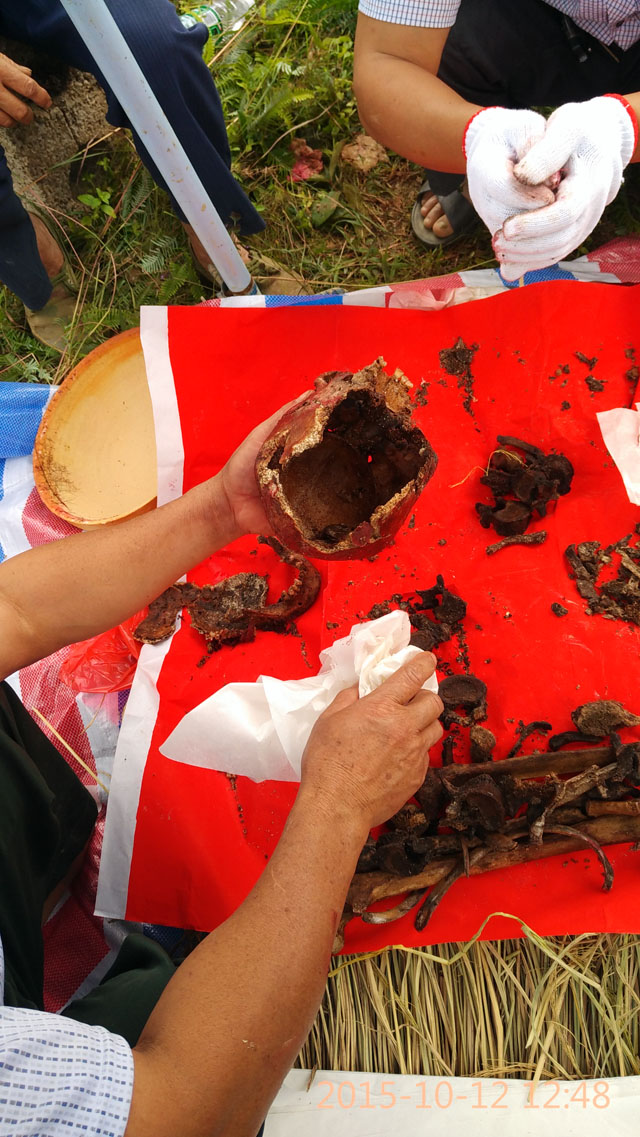 此坟为我一位亲友的奶奶坟,未开坟前我断定里面有水及金坛开裂,在有水的情况下肯定有毛草根入棺、及白蚁,而且骨头发黑,又发霉;结果一挖起来果真一模一样。